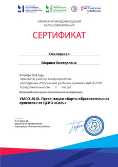 09 ноября 2018 г. в рамках Всероссийской научно-практической конференции УМСО-2018 принято участие в мероприятиях Корпорации "Российский учебник", о чём получены соответствующие сертификаты: